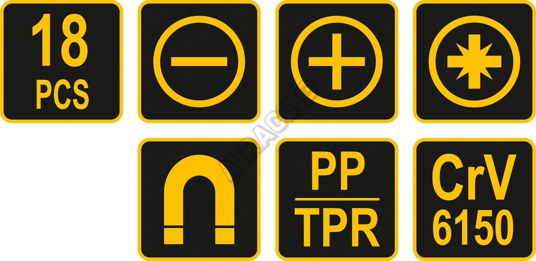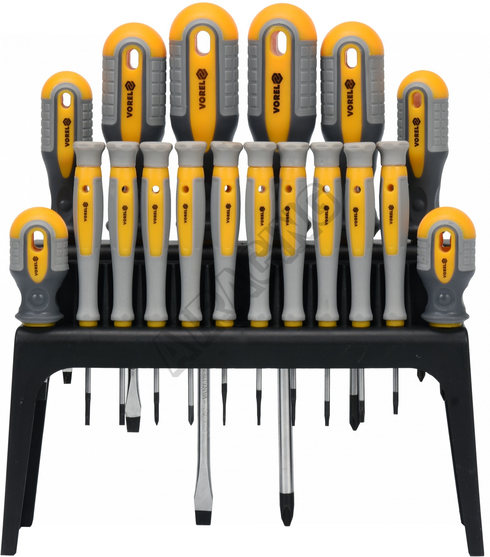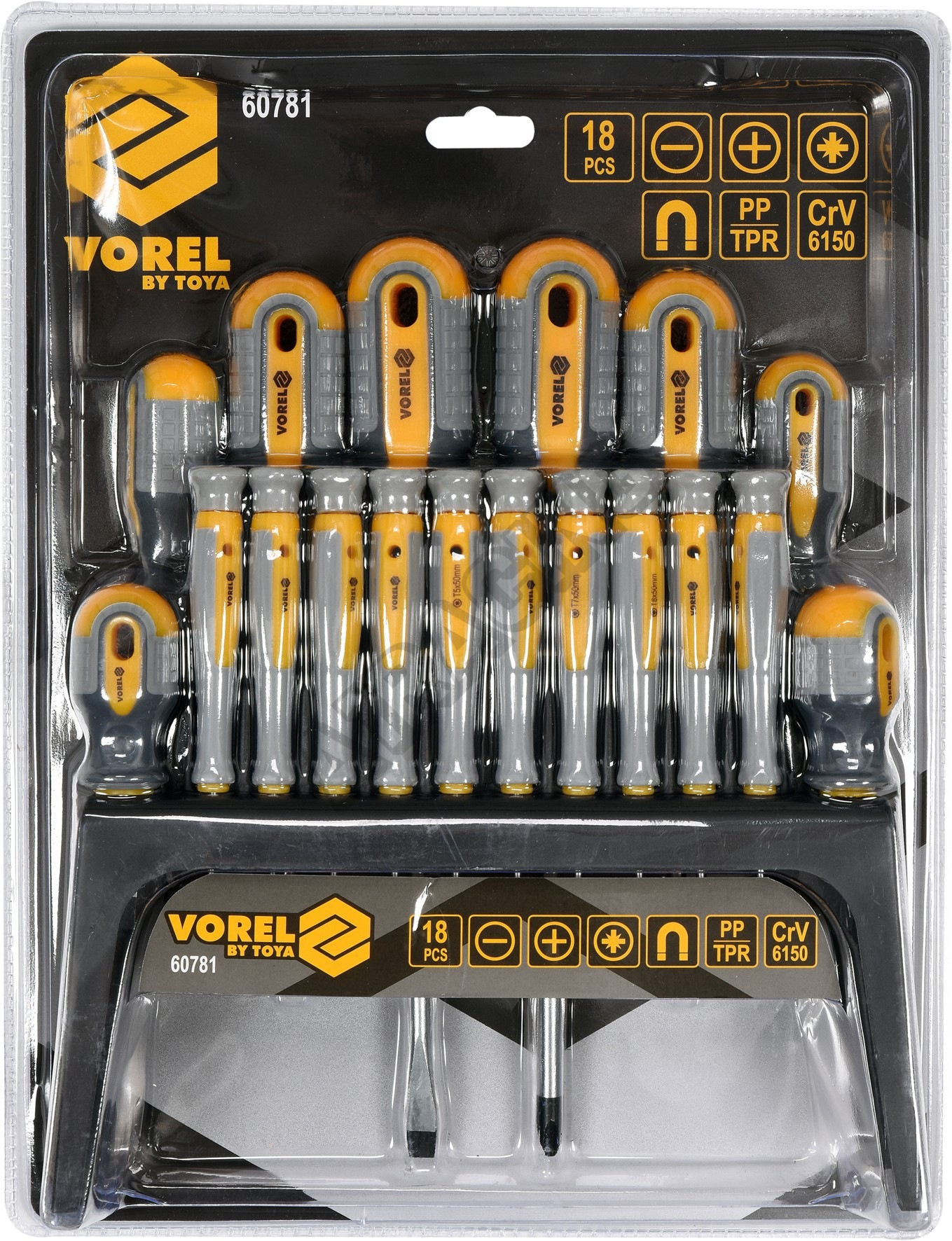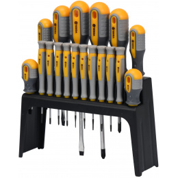 Sada 18ks šroubováků vyrobených z CrV6150 oceli s ergonomicky tvarovanými rukojeťmi z protikluzného PP a TPR.