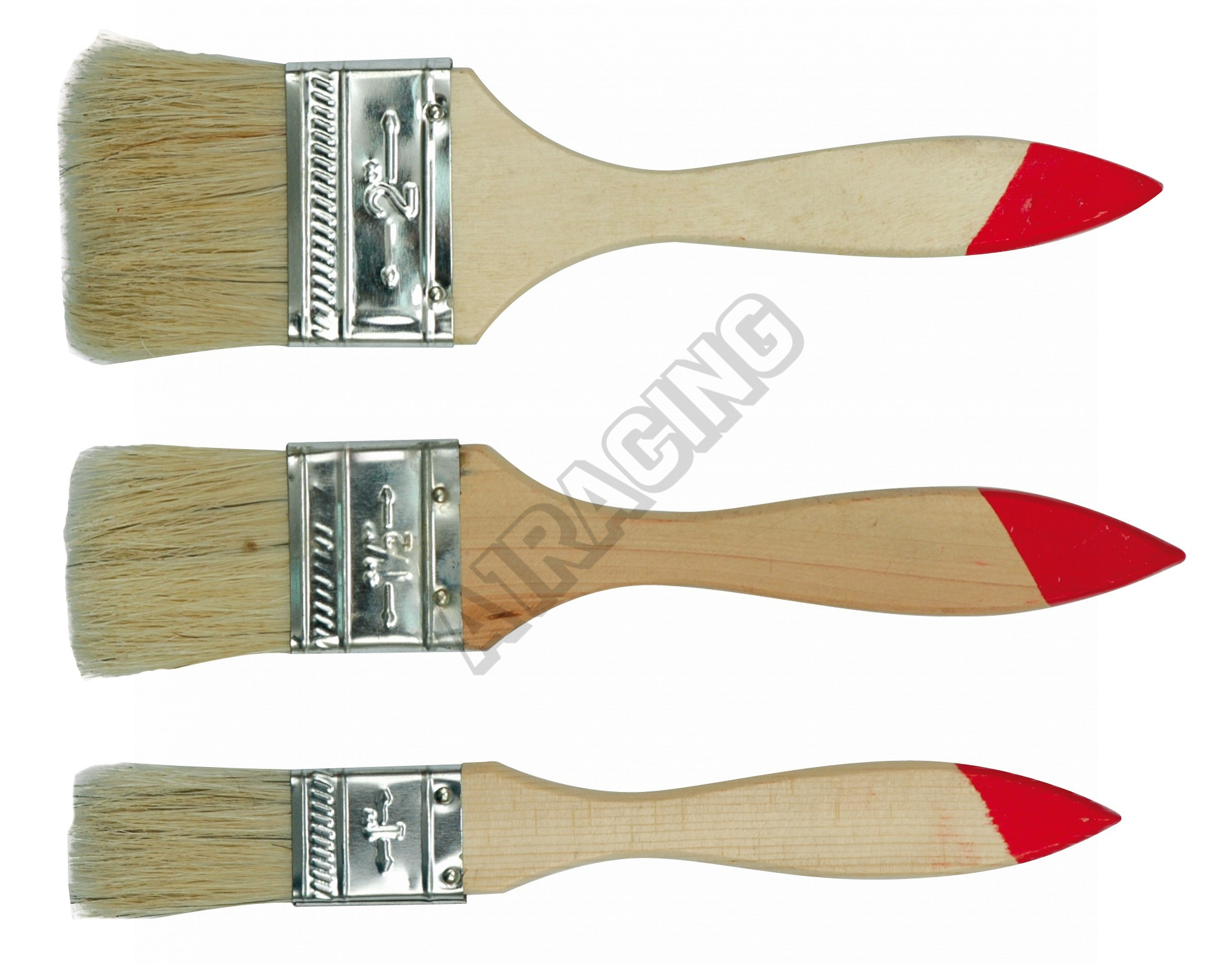 Sada tří plochých štětců anglického typu. Štětiny orámované kovovou objímkou na dřevěné lakované rukojeti.