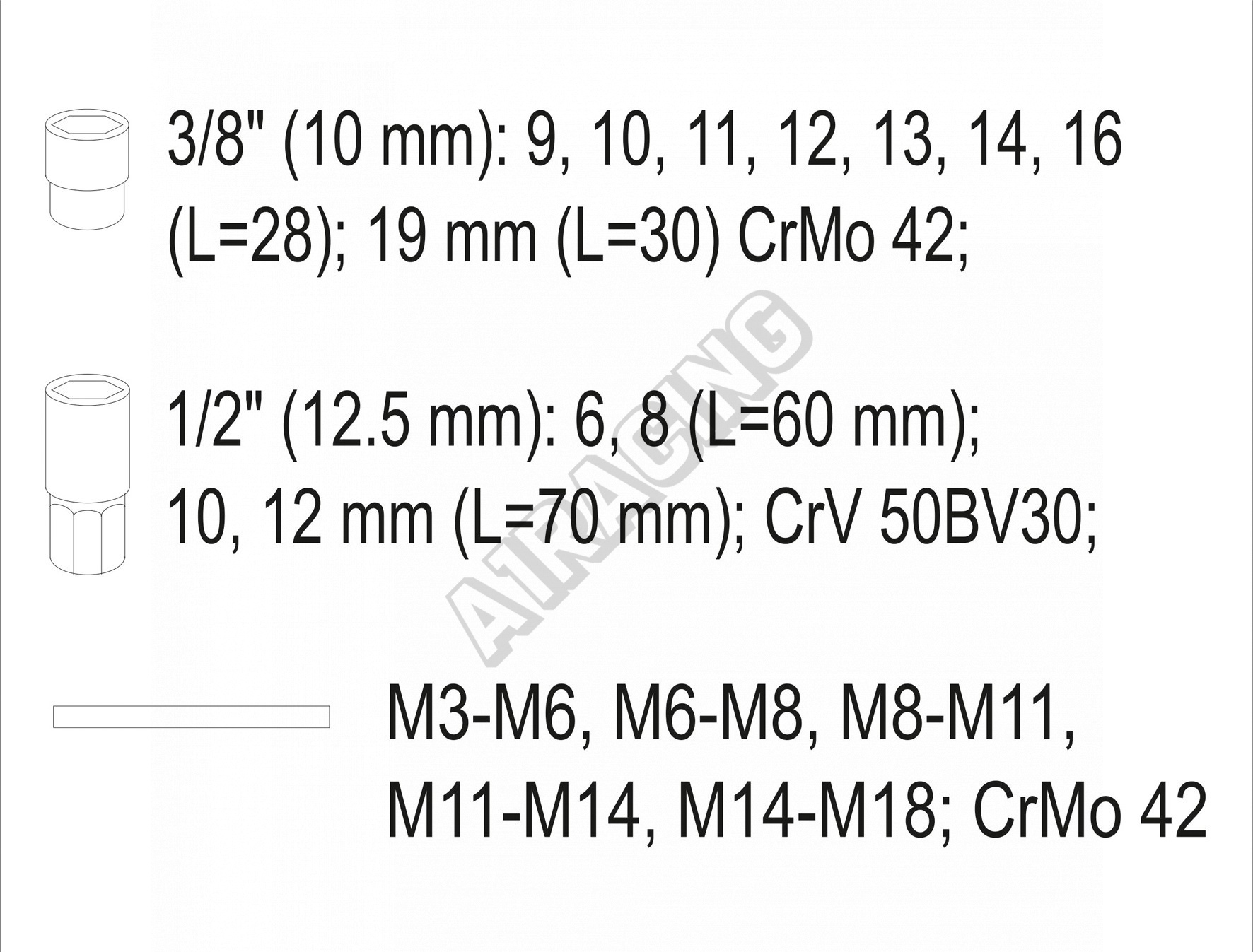 Obsah balení: Nástrčný klíč 3/8": 9, 10, 11, 12, 13, 14, 16 mm (délka 28 mm) Nástrčný klíč 3/8": 19 mm (délka 30 mm) Nástrčný klíč 1/2": 6, 8 mm (délka 60 mm) Nástrčný klíč 1/2": 10, 12 mm (délka 70 mm) Závitník: M3-M6; M6-M8; M8-M11; M11-M14; M14-M18Zobrazit celý popis