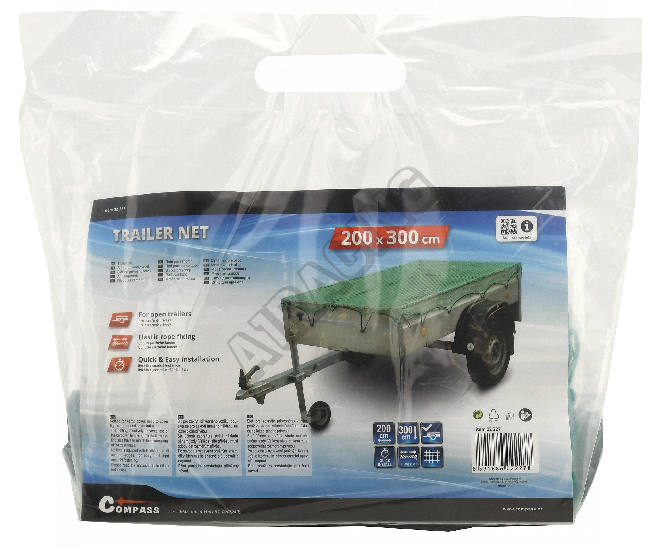 Veľkosť siete musí zodpovedať rozmeru prívesu, táto sieť má rozmery 200 x 300 cm s okami štvorcového tvaru srozmermi 4 x 4 cm.