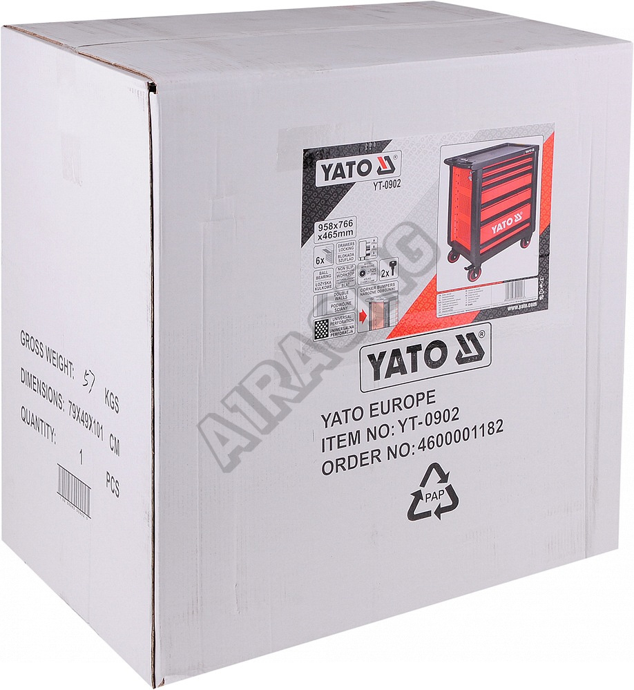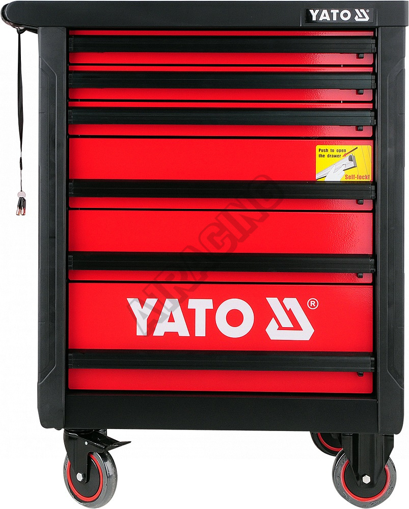 Dílenská skříňka značky YATO, vybavena 6 zásuvkami s kuličkovými ložisky s centrálním zamykáním. Skř