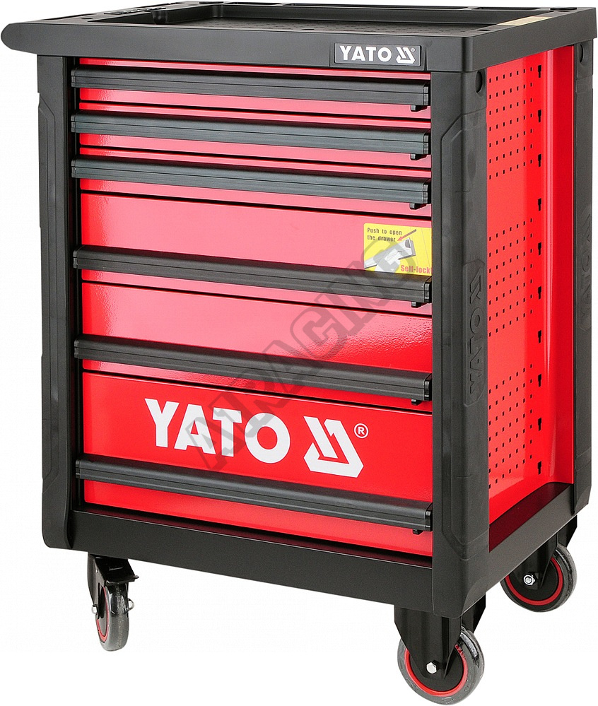 Dílenská skříňka značky YATO, vybavena 6 zásuvkami s kuličkovými ložisky s centrálním zamykáním.