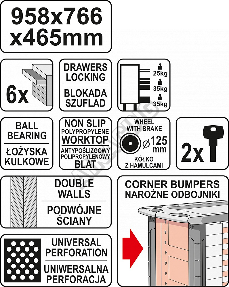 Skříňka o rozměrech 958 x 766 x 465 mm je zhotovena z oceli, celková nosnost činí 450 kg. První 3x horní zásuvky mají nosnost po 25 kg, a spodní 3 zásuvky mají nosnost 35 kg.