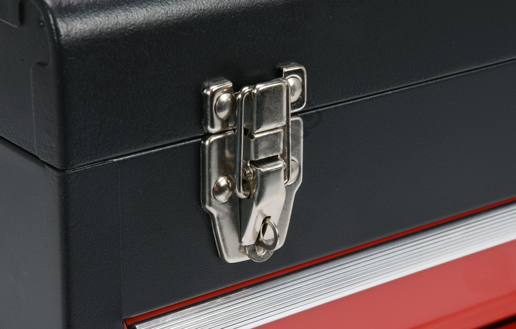 Vrchní úložný prostor je uzavíratelný pomocí dvou kovových spon s možností zajištění přidáním zámku. Spodní polovina skříňky je opatřena dvěma zásuvkami, které jsou uloženy pomocí kuličkových ložisek na kovovém vedení.