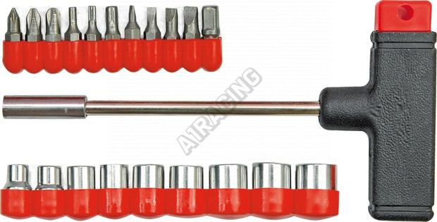 Šroubovák ve tvaru T v sadě nástrčnými klíči a bity. Díky speciálně tvarované rukojeti ve tvaru T vám nebude šroubovák prokluzovat v dlani, na rozdíl od běžných šroubováků, ani při větším záběru.