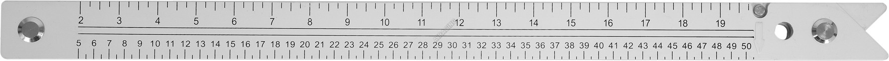 Úhelník je spojen ocelovýmy nýty. Na jednom z ramen je měřítko v centimetrech a palcích.