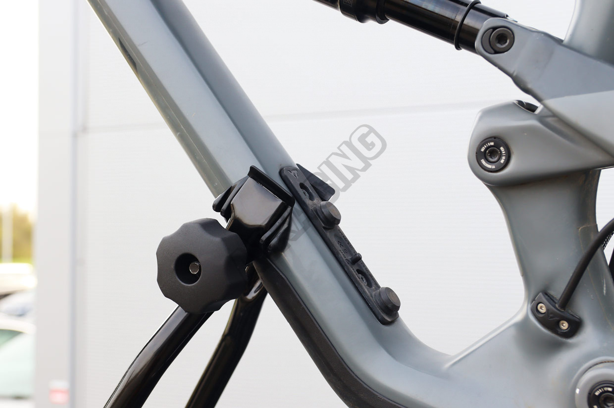 - Pevná spona účinne upevňuje rám bicykla v držiaku, a plastové pásky zabezpečujú kolesá