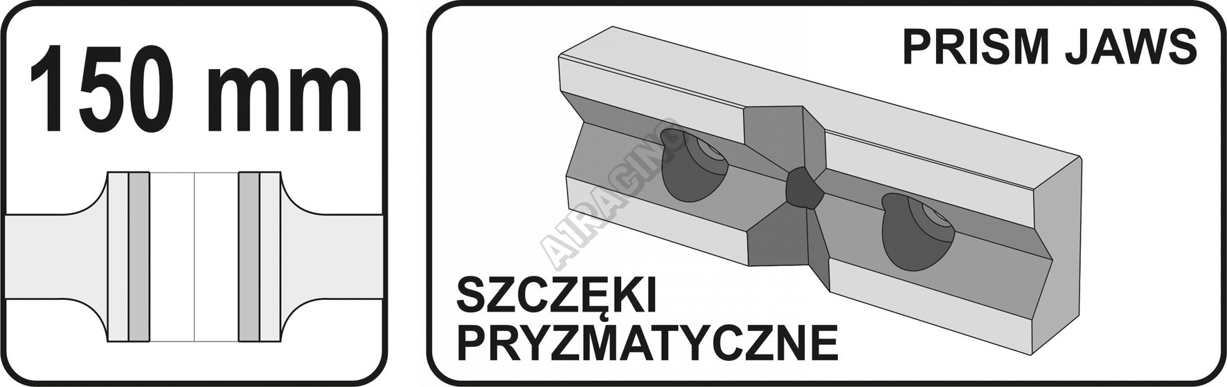 Strojný zverák 150 mm, telo z liatiny. dĺžka tela cca 160 mm. Montážna vzdialenosť 135 mm, max. Vzdialenosť čeľustí 120 mm, Oceľové čeľuste s hranolom, skrutkou s ryhovanou rukoväťou a uvoľneným čapom.