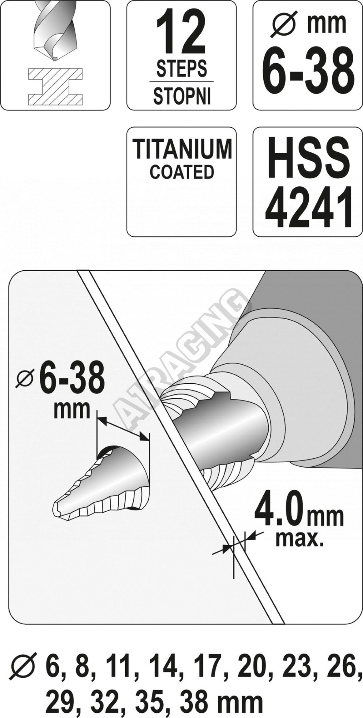 Každý jednotlivý stupeň může vrtat otvor do maximální hloubky 4 mm. Celkově je vrták vybaven 12 stupni o průměrech 6; 8; 11; 14; 17; 20; 23; 24; 29; 32; 35 a 38 mm.