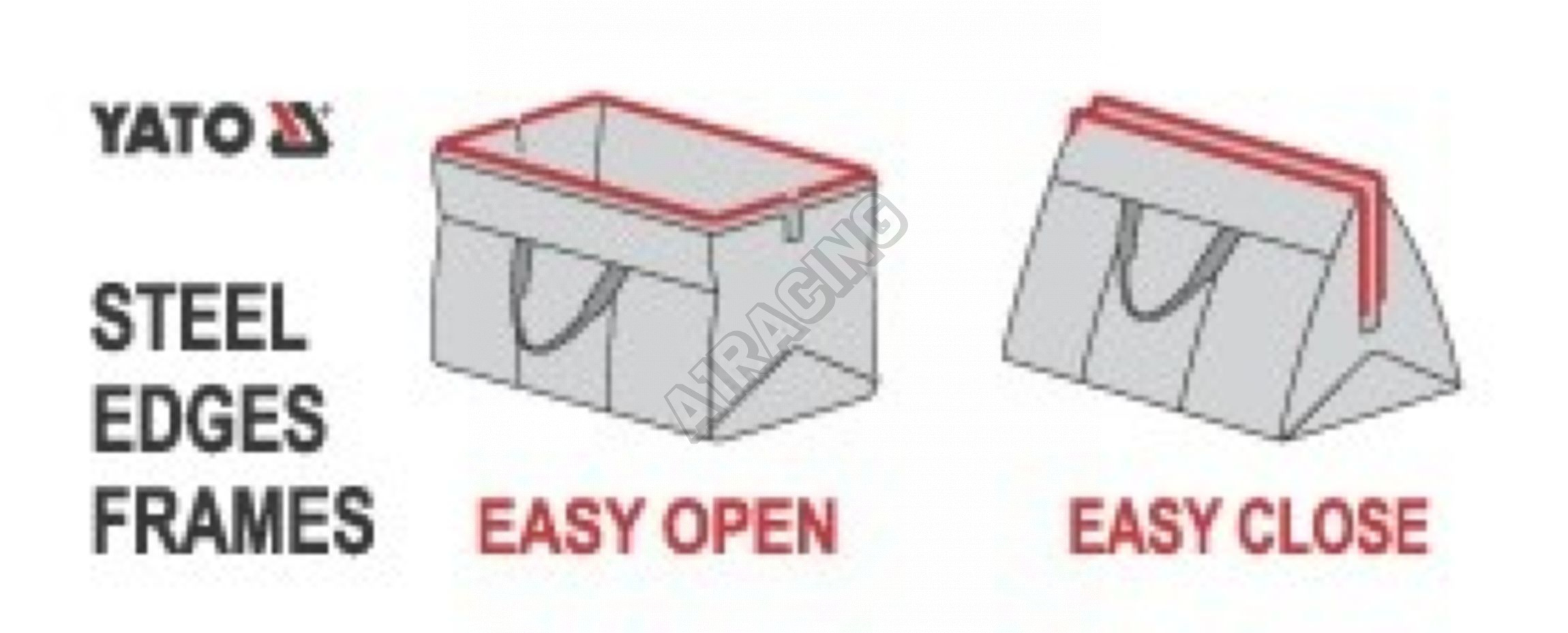 Praktická taška na náradie YATO vyrobená z vylepšeného nylonu, vystužená kovovou svorkou so závesmi pre ľahké otváranie a zatváranie.