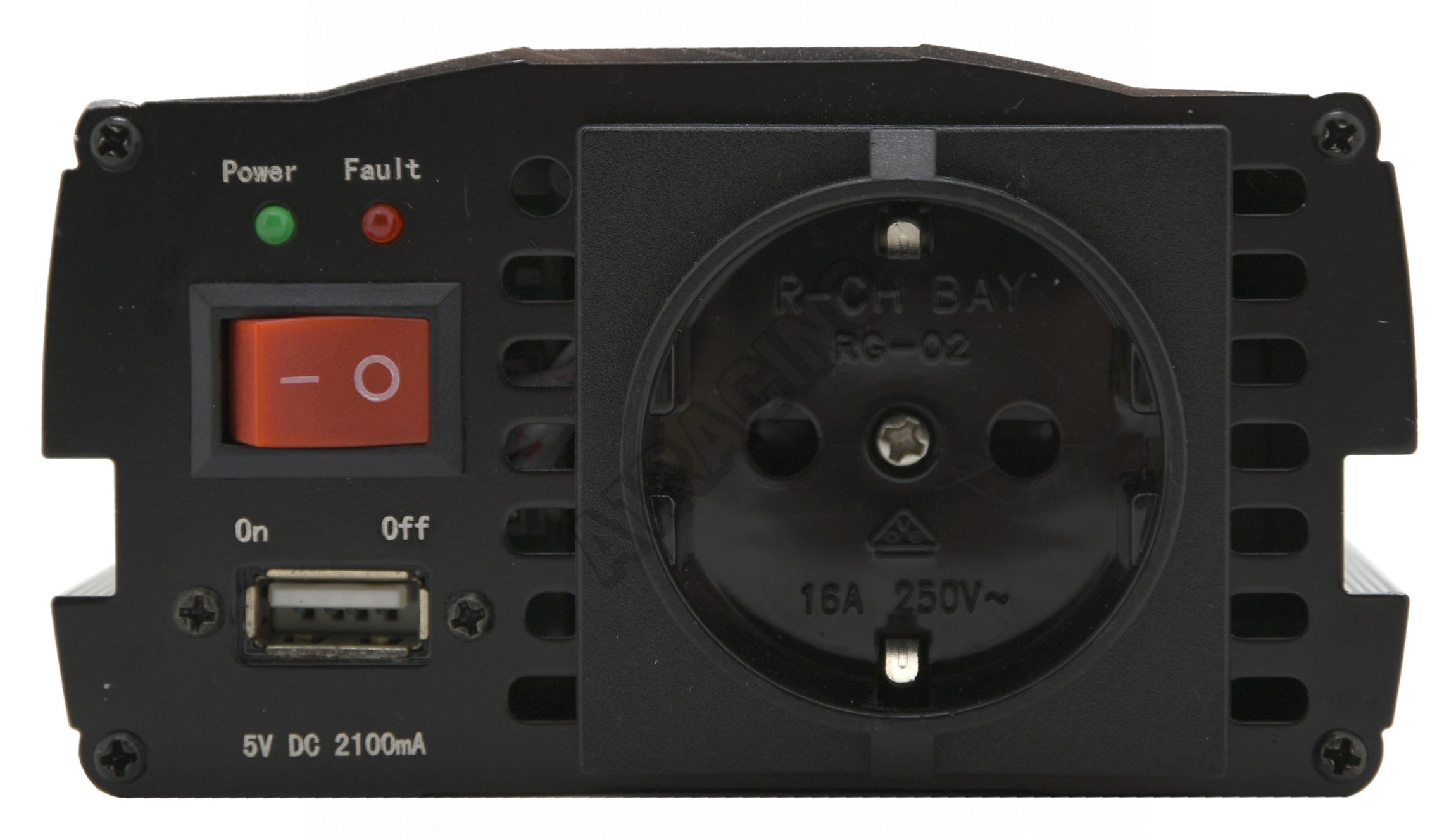 Výstup měniče je osazen běžnou zásuvkou 230V evropského typu pro spotřebiče bez zemnícího kolíku tj "dvoukolíková" zástrčka. Navíc je k dispozici USB zásuvka, vhodná pro MP3 přehrávače, mobilní telefony a další zařízení, která se nabíjejí, či napájejí běžným USB zdrojem 5V až do příkonu 2100mA.