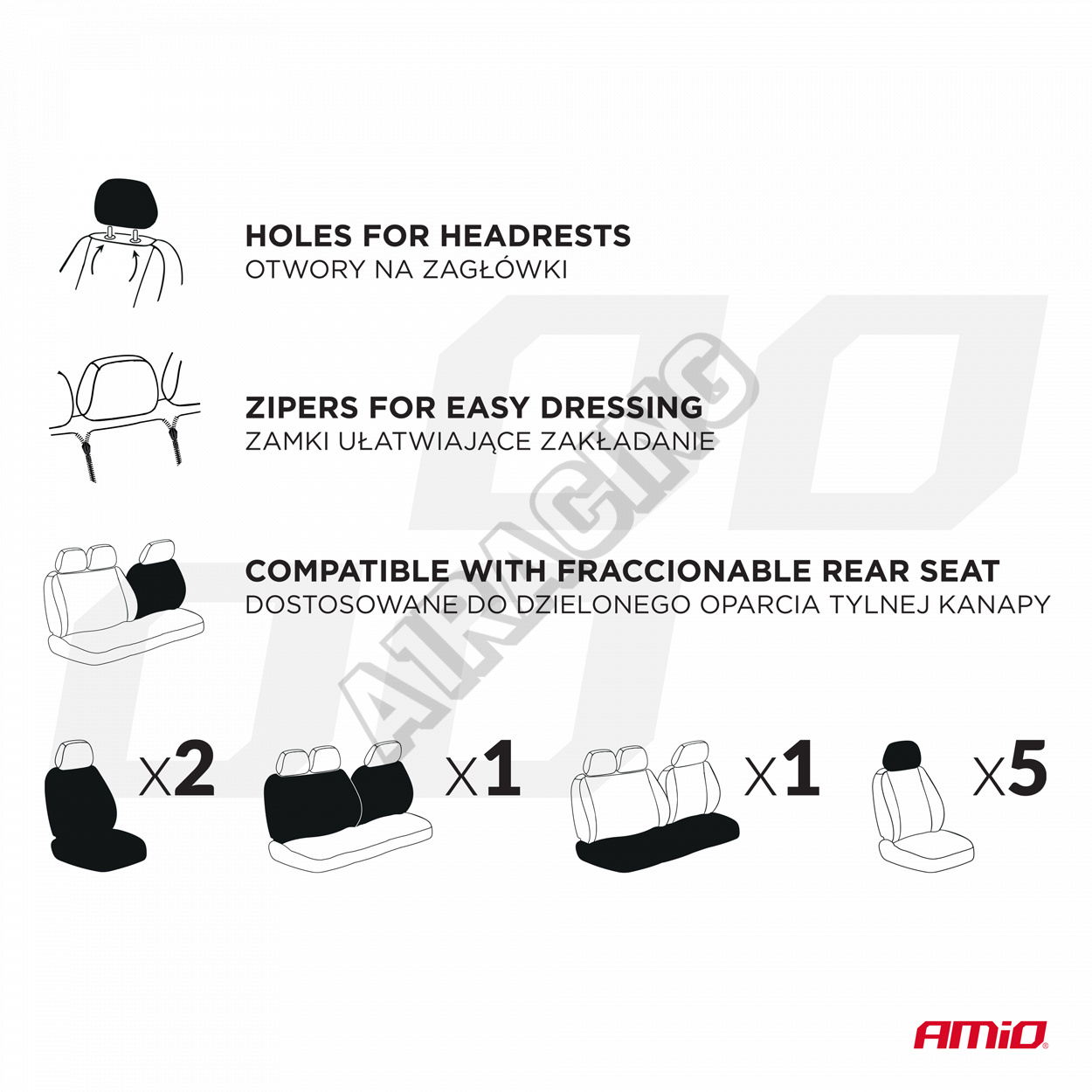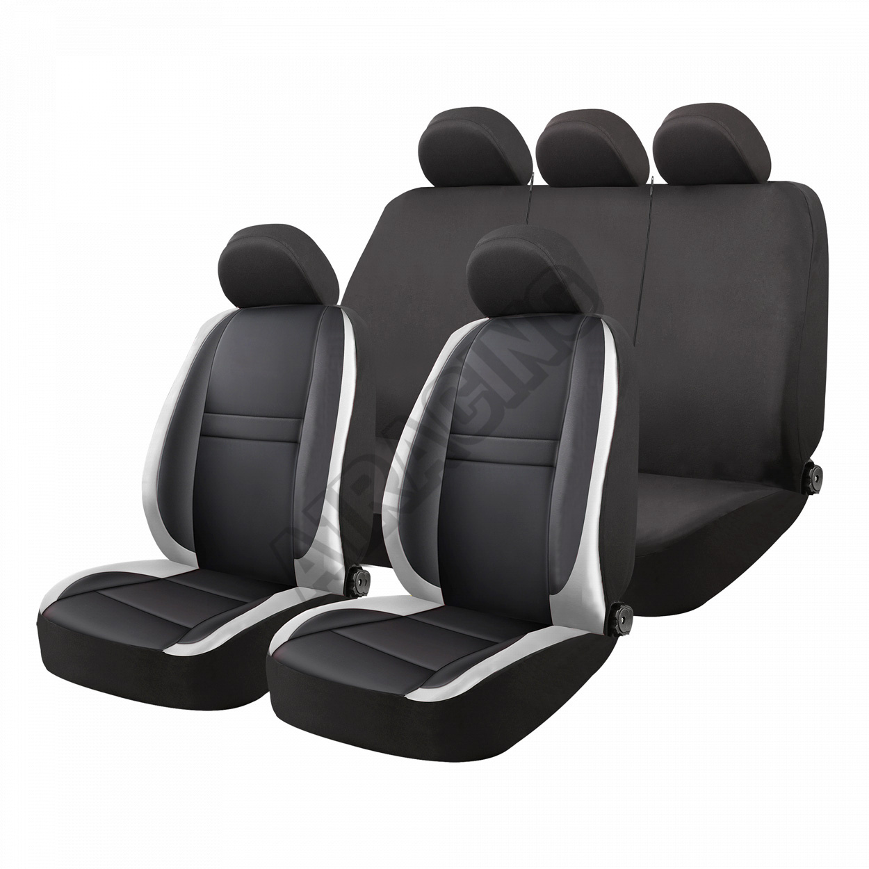 Sada 9 kusov zahŕňa poťahy na dve predné sedadlá, delenú zadnú lavicu a sadu opierok hlavy. Univerzálne prispôsobenie pre väčšinu modelov osobných automobilov.
