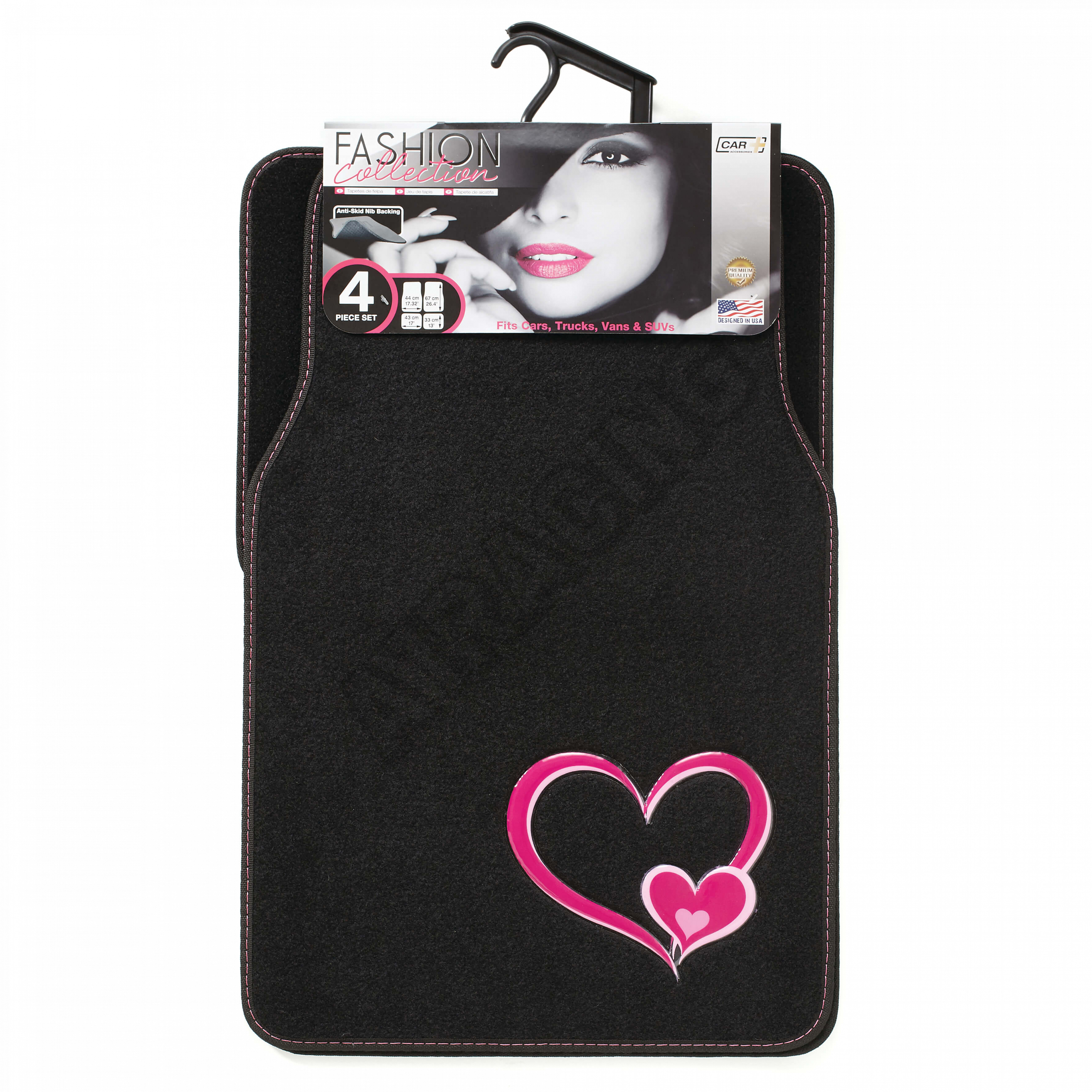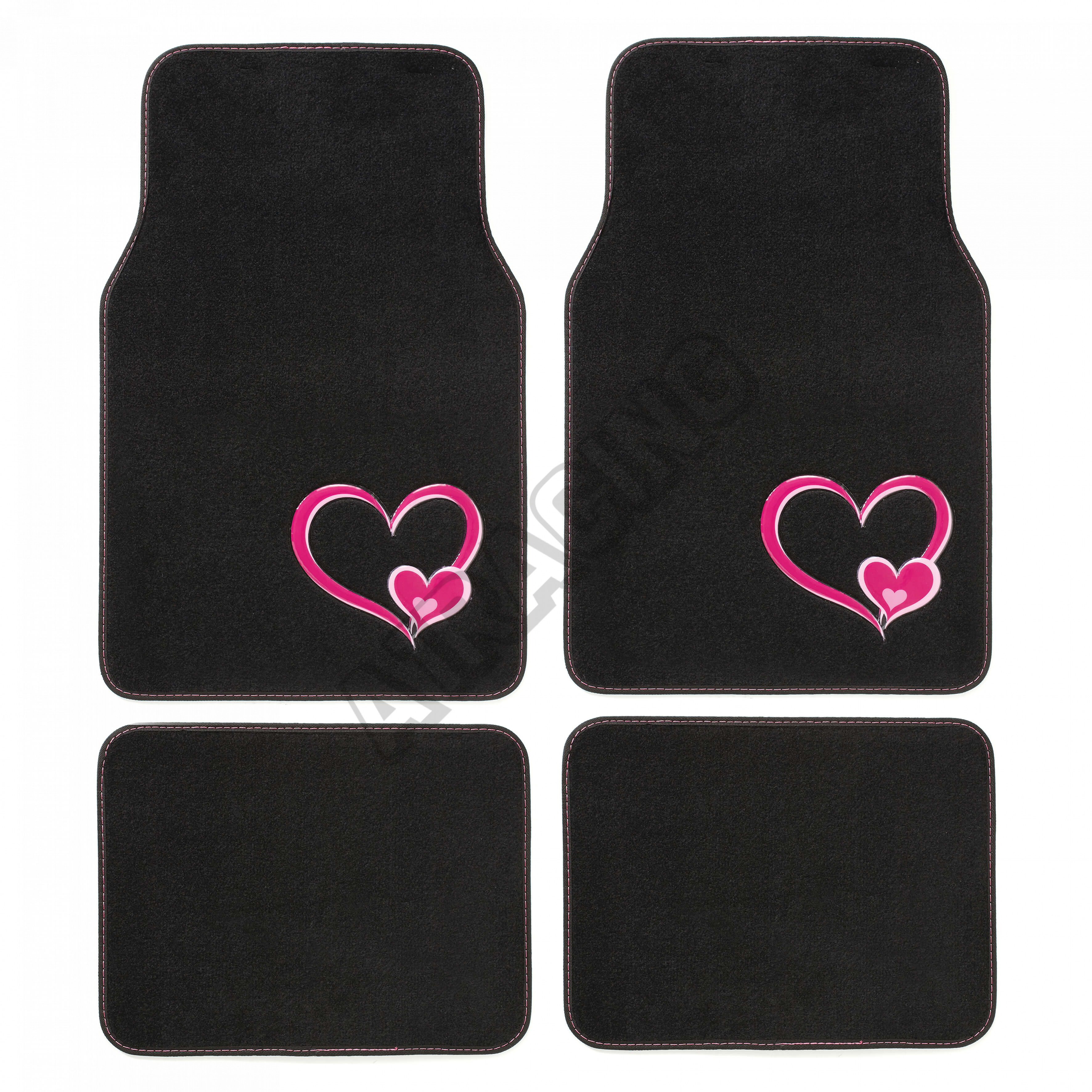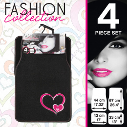 Kvalitná sada čiernych autokobercov s motívom srdca. Rozmery kobercov sú uvedené na hlavnej fotke. Kompletná sada 4 ks.
