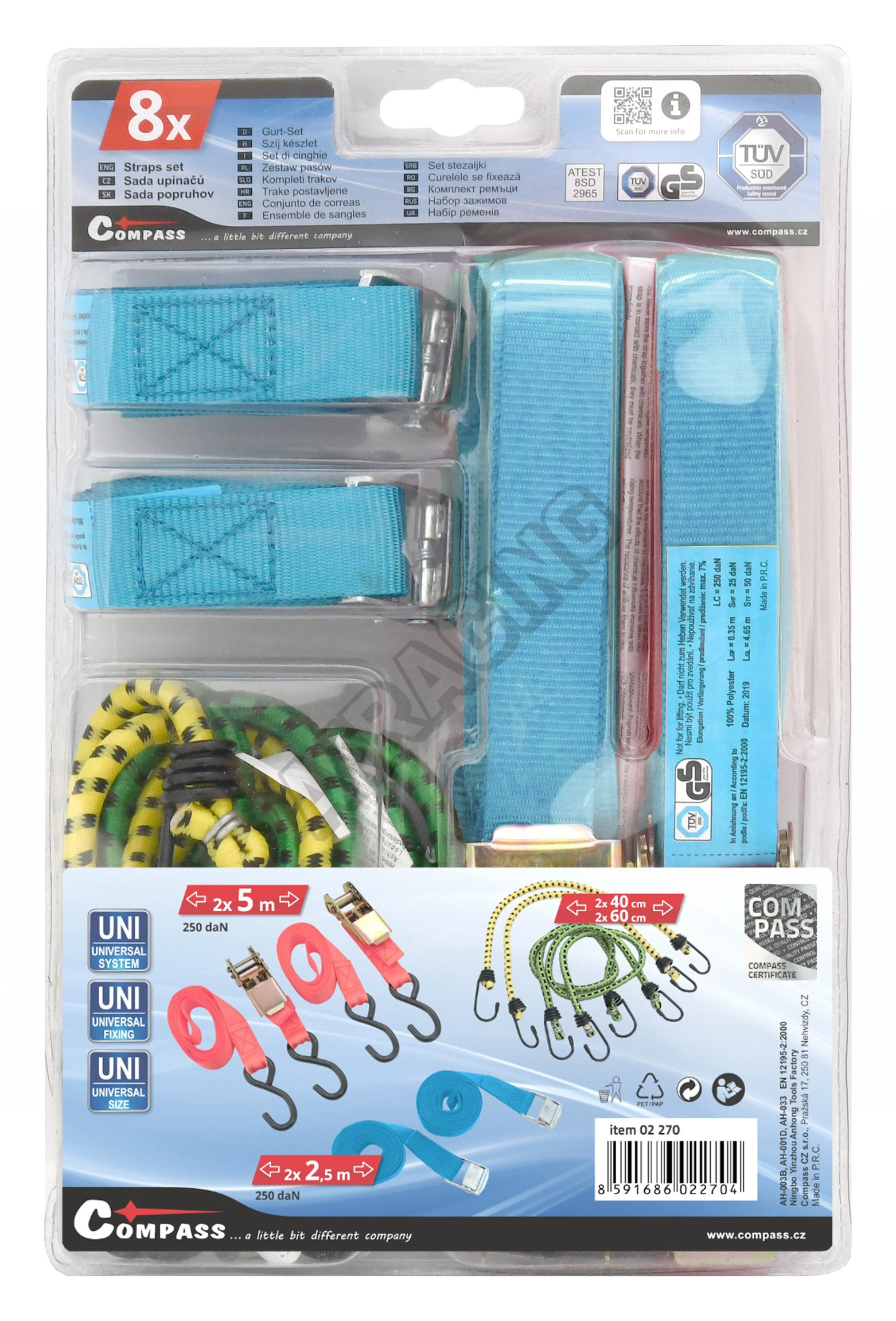 Univerzální sada upínacích popruhů a pružných upínačů s homologací TÜV/GS, k zajištění předmětů, zavazadel, nebo nákladu.