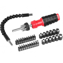 Súčasťou balenia sú sada bitov, nástavcov pre krížový a plochý skrutkovač + pružné predĺženie pre zmenu uhla skrutkovanie.