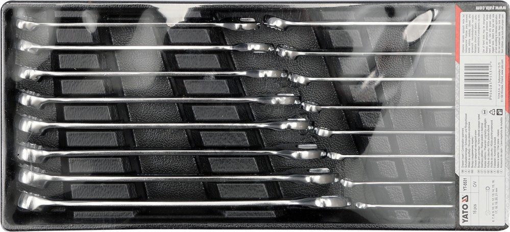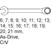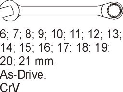 Sada 16 kusů očkových klíčů z CrV oceli. Funkce AS-DRIVE umožňuje vyvinout větší kontaktní sílu, neboť ke kontaktu se šroubem nedochází na hranách šestihranu, nýbrž v první třetině styčných ploch.