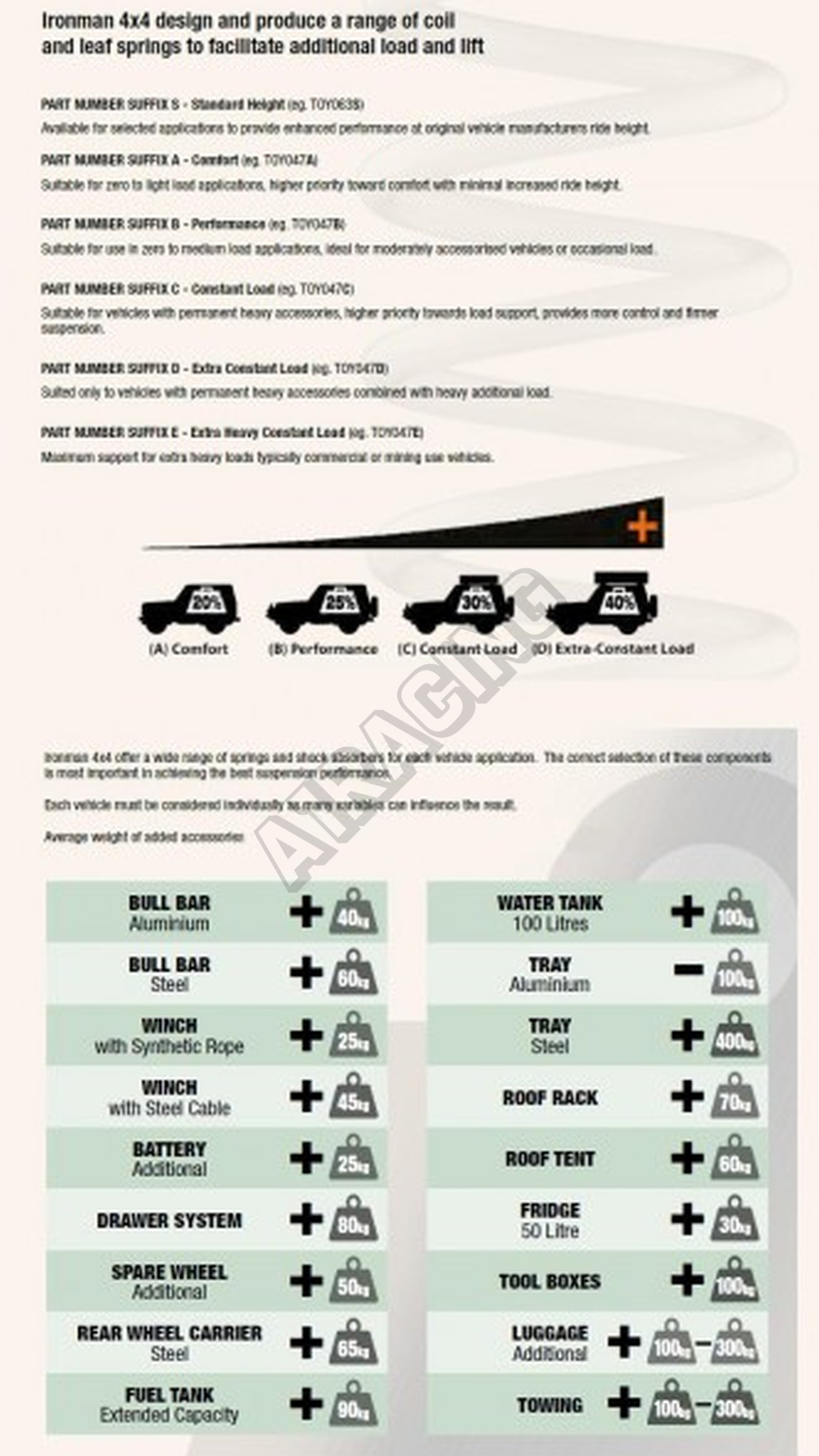Kvalitné zosilnené predné a zadné pružiny kutového austrálskeho výrobcu Ironman 4x4 vyrobené zo špeciálnej ocele vinutej za studena. Týmto spôsobom decentne zdvihnete podvozok vášho auta bez žiadnych ďalších úprav, kde len pružiny vymeníte za originálne. Svetlá výška auta po inštalácii sa zdvihne + 30 mm. Predná a zadnbia náprava je navyše posilnená o 50-110 kg, Auto po tejto inštalácii zvýšených pružín IRONMAN4X4 snehu väčšie zaťaženie a pritom nestratí nič zo svojho komfortu. Cena je vždy za 1 sadu 2 kusov pružín na prednú alebo zadnú nápravu.