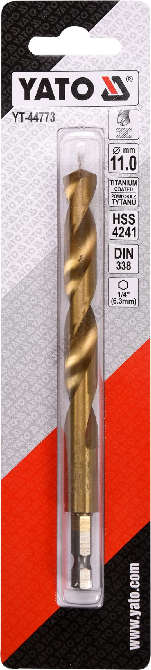 Vyrobeno z rychlořezné HSS oceli s Titanovým povlakem a vrcholovým úhlem 135°. Vrták je opatřen HEX 1/4" uchycením.