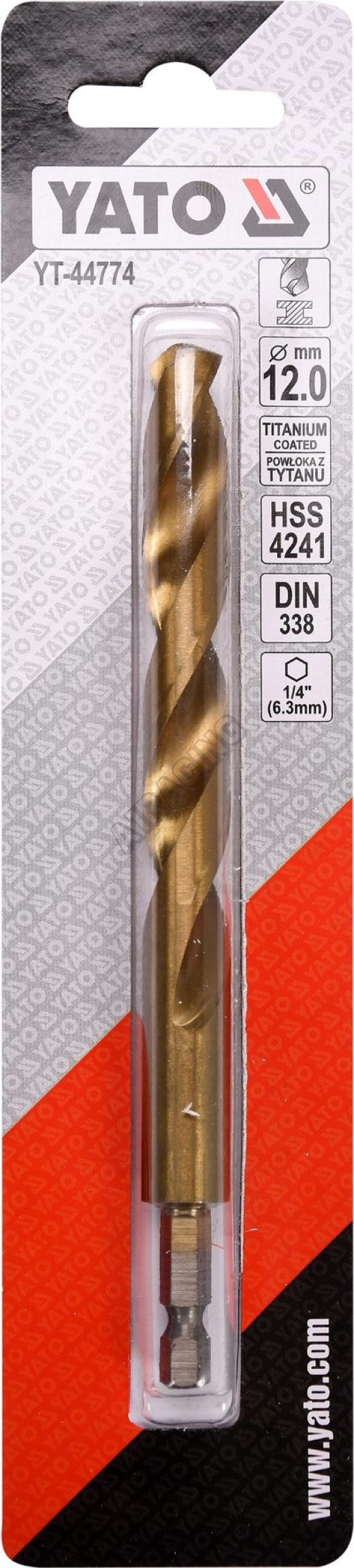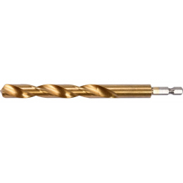 Vyrobeno z rychlořezné HSS oceli s Titanovým povlakem a vrcholovým úhlem 135°. Vrták je opatřen HEX 1/4" uchycením.