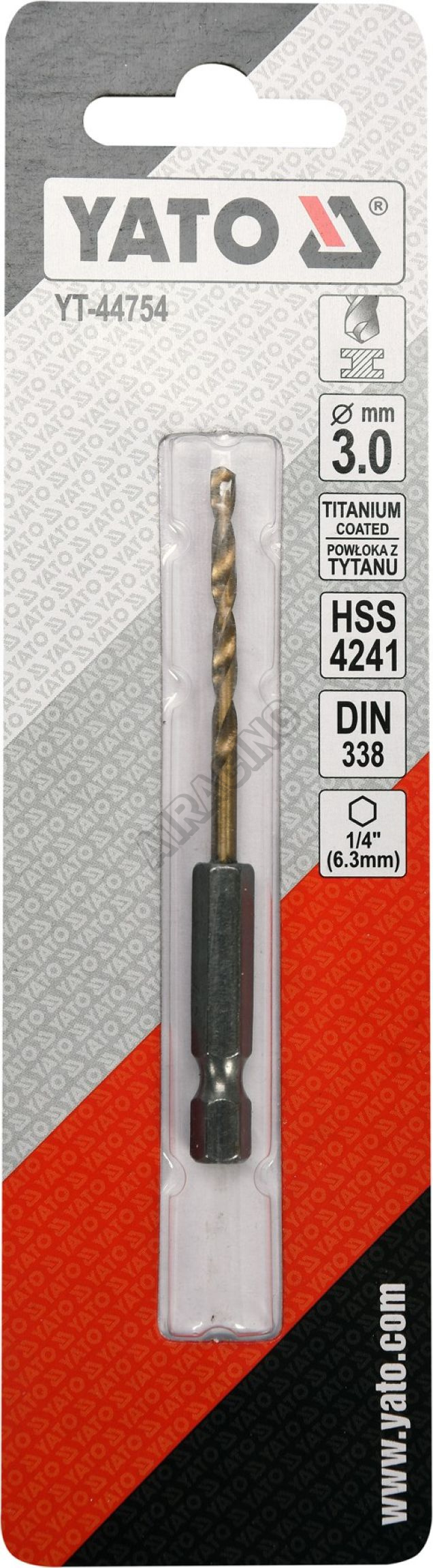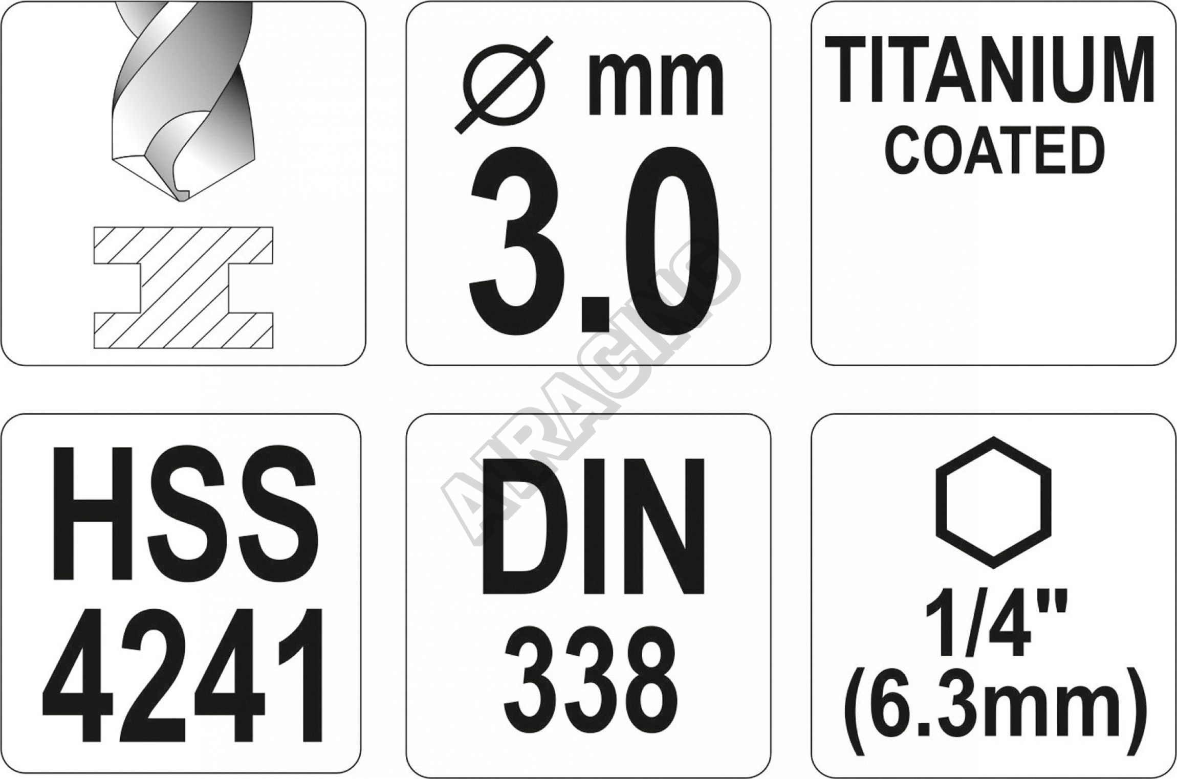 Vyrobeno z rychlořezné HSS oceli s Titanovým povlakem a vrcholovým úhlem 135°. Vrták je opatřen HEX 1/4" uchycením.
