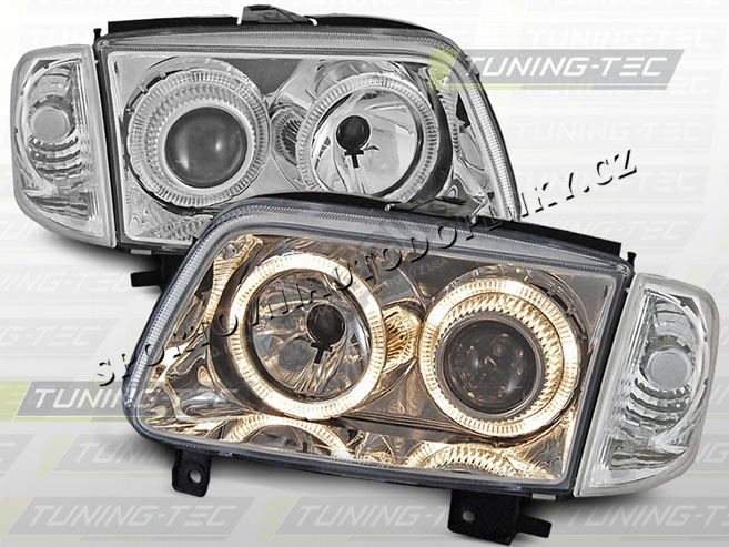 VW Polo 6N 2 1999-01 Predné číre svetlá Angel Eyes chrome - cena za pár 2 ks, tyto světla mají homol