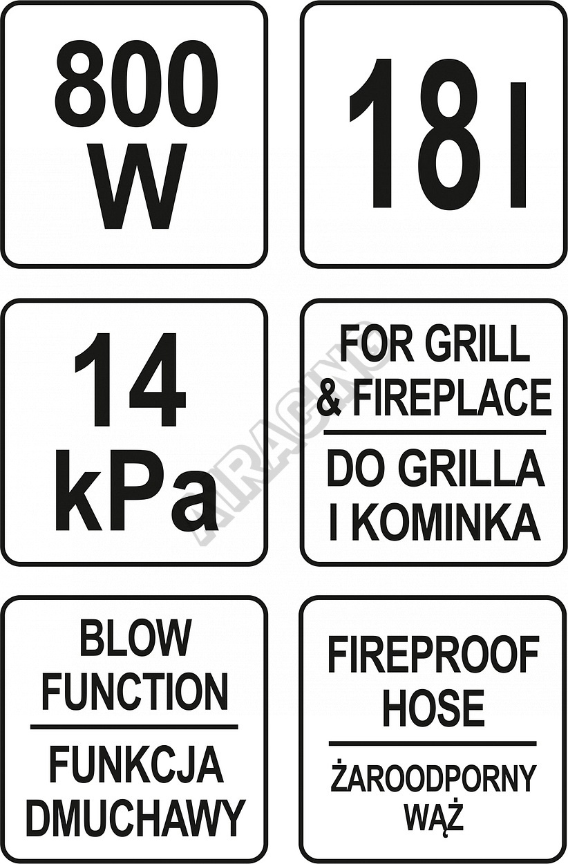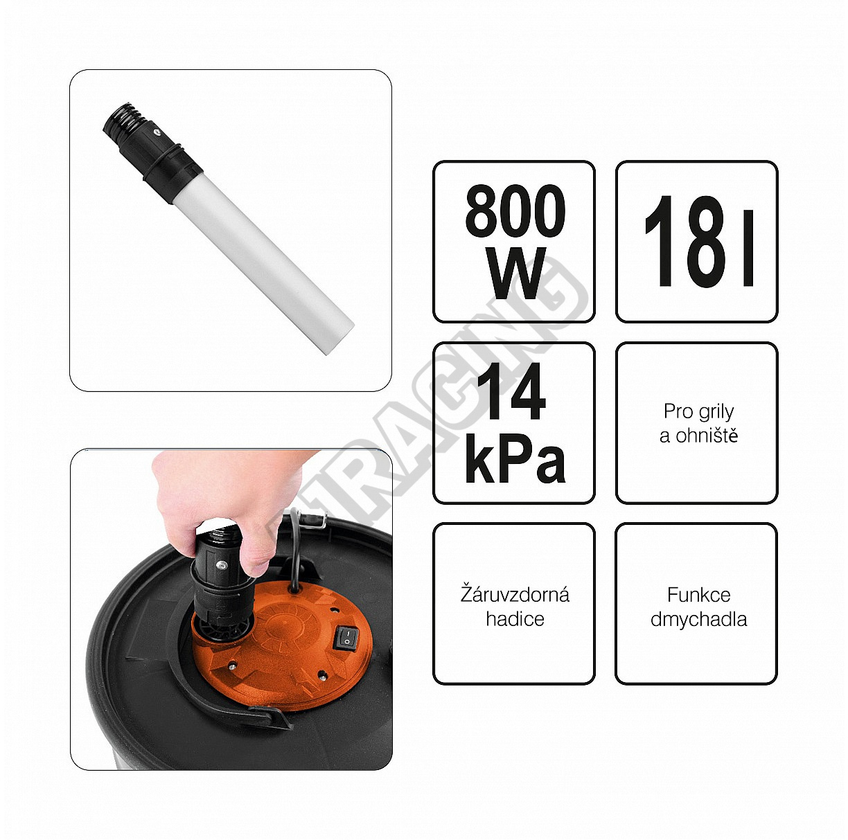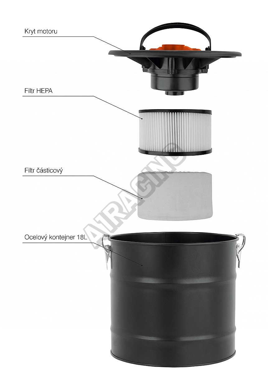 Sací hadice je tepelně odolná a je zakončena hliníkovou sací hubicí. Nádoba na popel je vyrobena z nerez oceli a její objem činí 18 litrů.